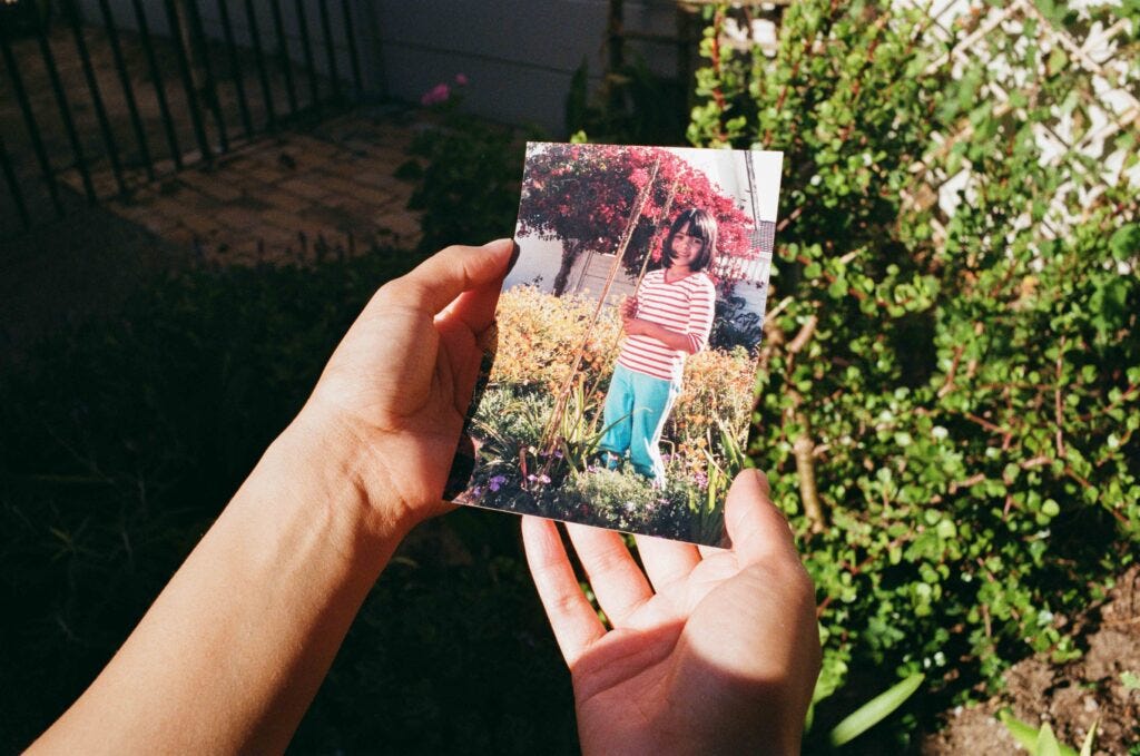 The ‘Julia’s Garden’ photographs visualise such an interiority. The intimacy and tenderness with which Visule photographs freshly cut ‘bush lilies’ and potted anthuriums in her living room reveres her little garden. The close portraits of hands that cut, prune, carry and garden bear the weight of black tending. As open gestures, these portraits of hands that hold other photographs speak against the gestures made by the shadows of monumental men. These portraits signal us to look, not again, but inward, deeper into what we see. These photographs of family photographs that are kept in hands appear as nested memories, memories kept inside of other memories, kept inside a garden or Julia’s living room. ‘Amy in Julia’s Garden’ and ‘Julia’s Garden II’ double down on the flatness of the image, on time’s passing. At the heart of Visule’s project is another way into a memory of a garden.